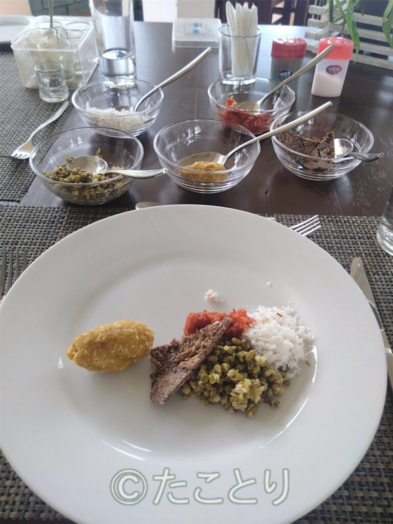 そして今日も又々シロダーラです。で、朝食は最近定番になって来ました、豆とココナッツの実を削った物、そして唐辛子ソース。それを混ぜて食べます。
