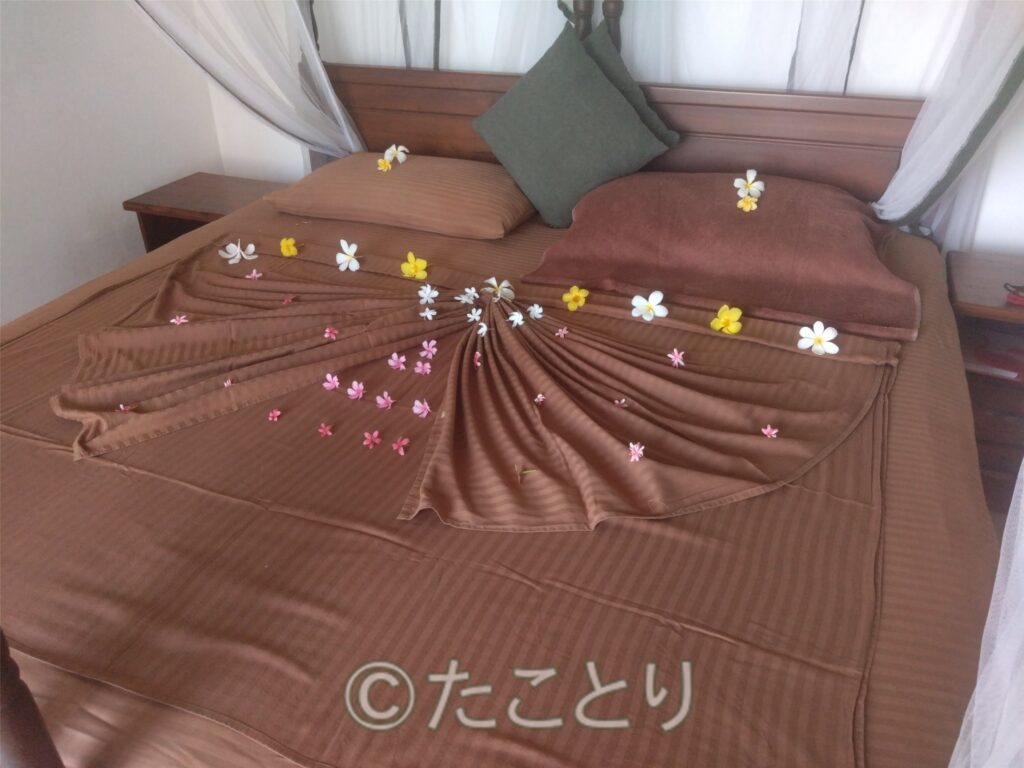 今日は黄色い花で飾ってくれました。又、今回もホント、色々なバリエーションのシーツとお花の飾りでとっても気分が上がります❣️