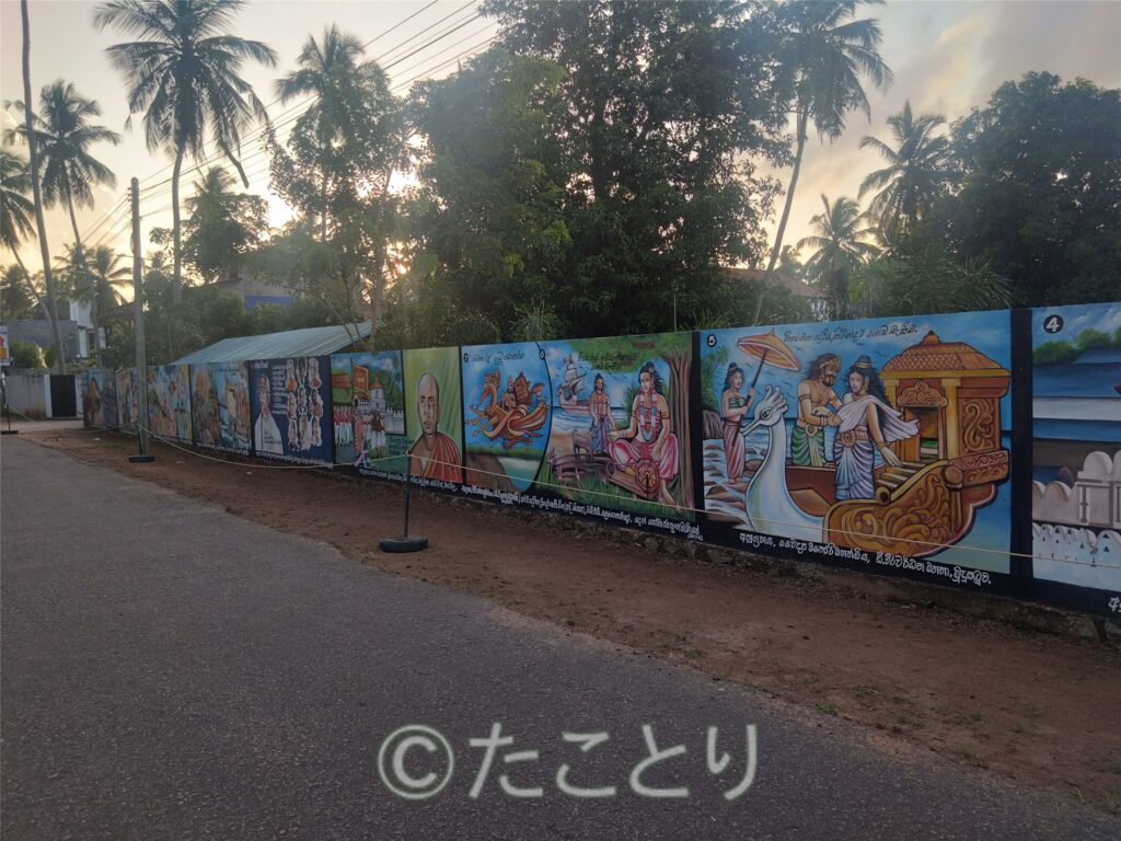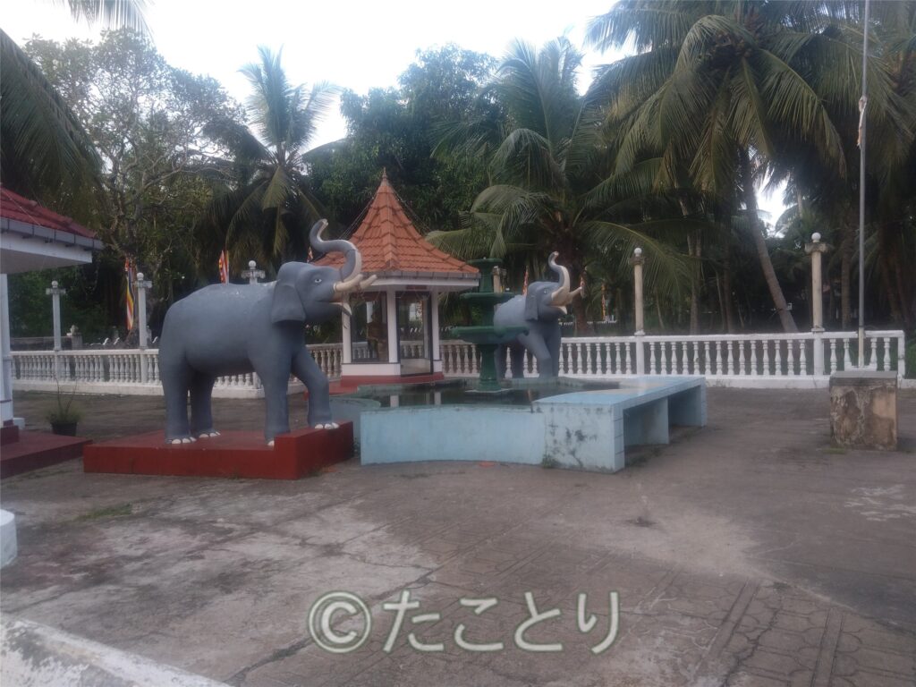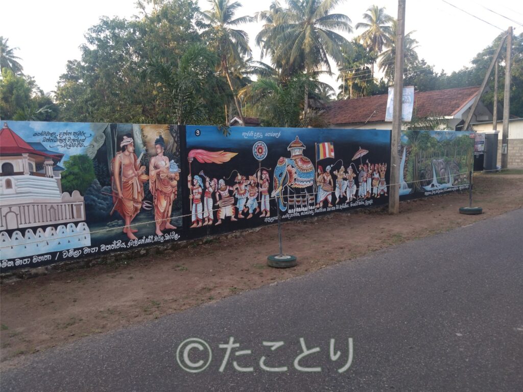 それからお寺にも歩いて再度お参り。気になっていた通りの壁の絵と寺院内の何の意味かはよく分からないけど派手な飾りとシュールな象さんをパチリ。