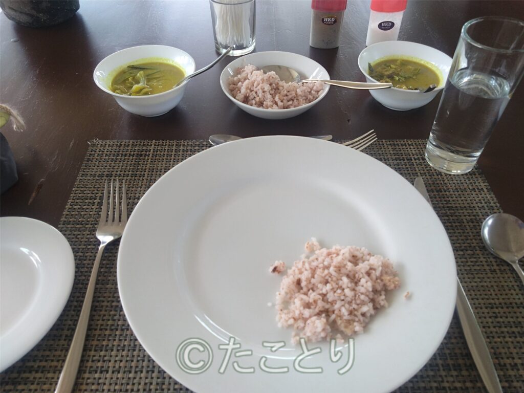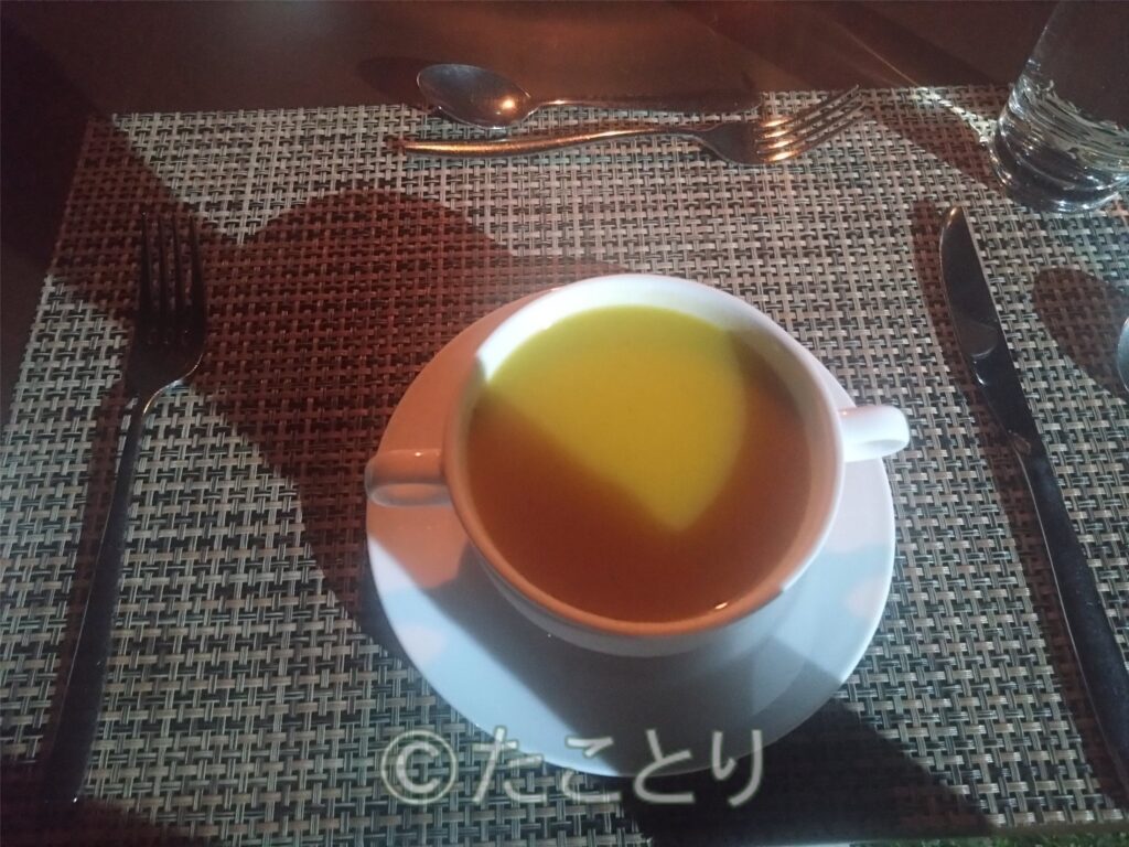 お夕飯はカレー味で無く、カボチャスープと私は腸内洗浄の準備のため蒸し野菜のガーリック炒めで美味しかった!また、本日が最後の女性のテーブルマットを綺麗にお花で飾ってあって、感動♡