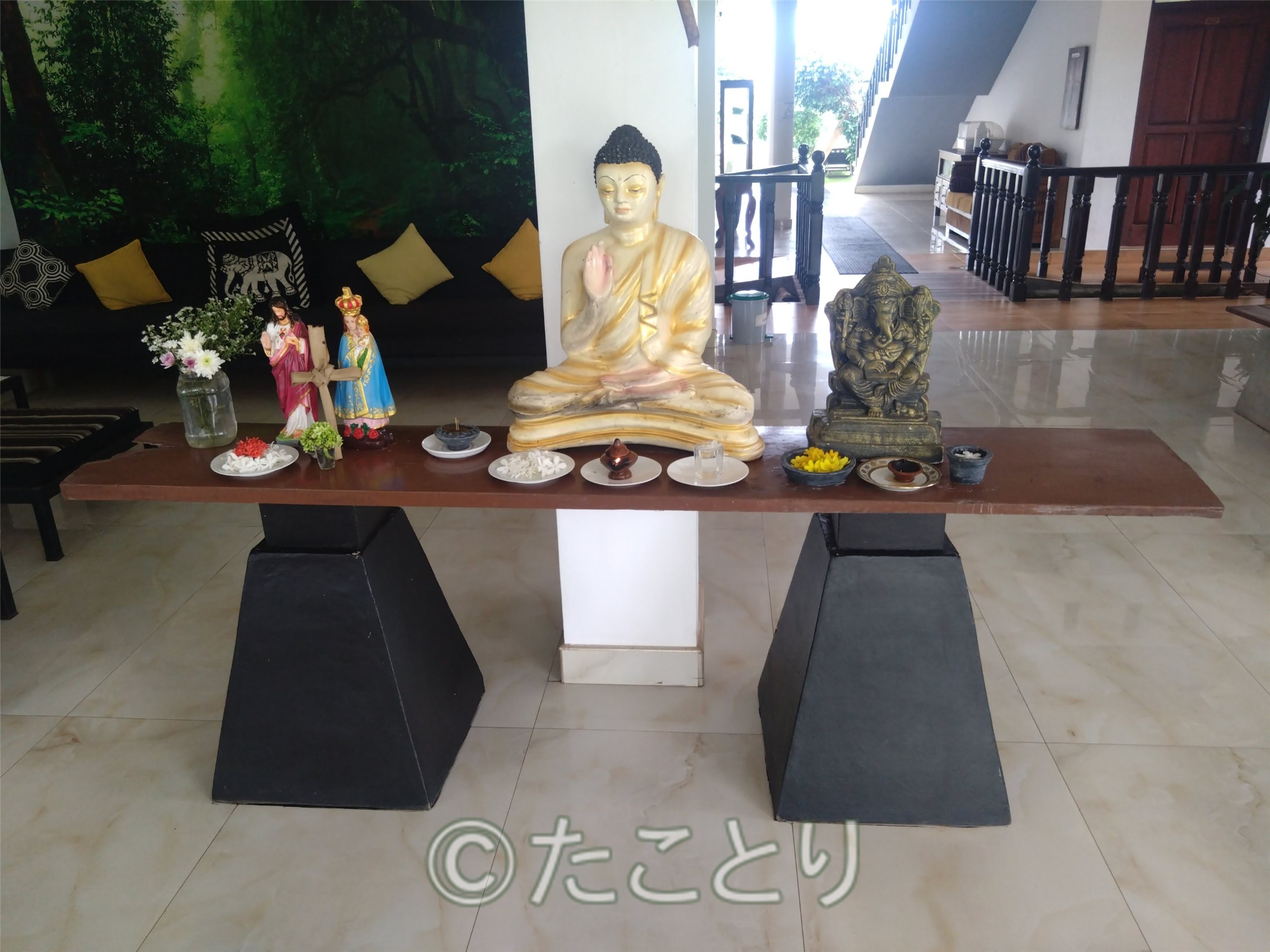 スリランカの多宗教を象徴するようなホテルの入り口に飾られている三つの神様たちです。皆さんはどの宗教なのかわかりますか?