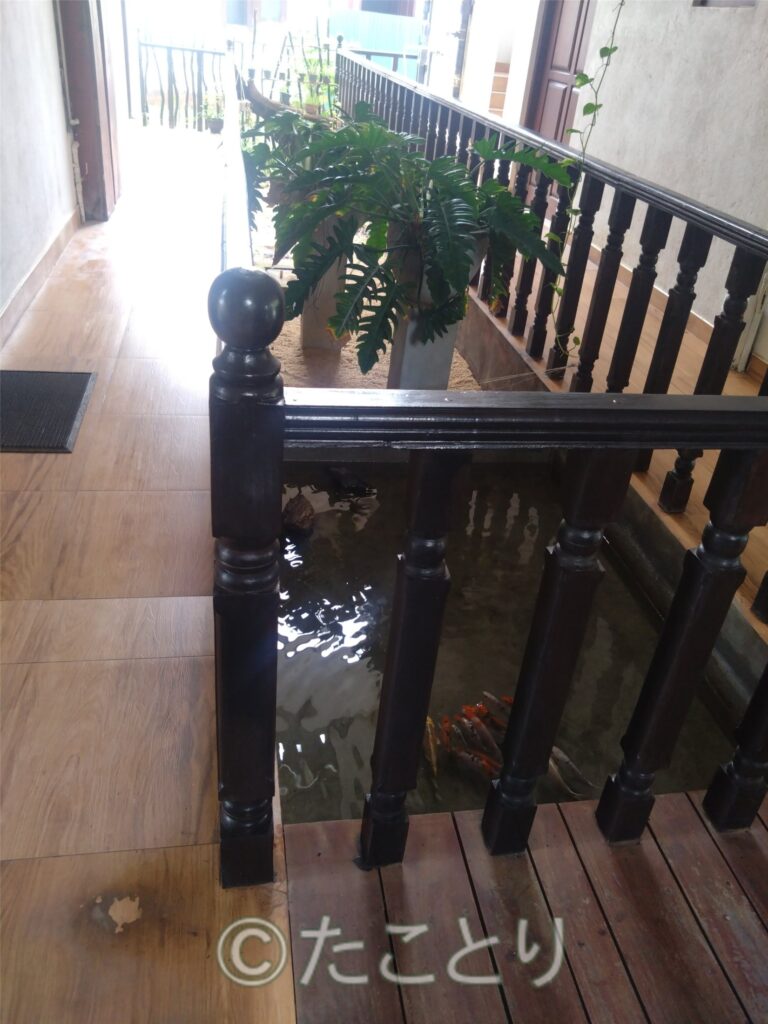 ホテルの門とホテルの中の小さな橋の下の鯉。