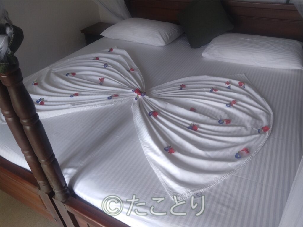 で、一日おきにベッドがお花とシーツの折り紙で飾り付け。