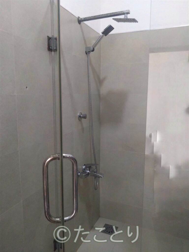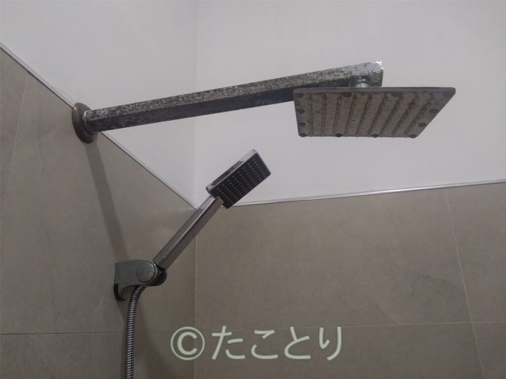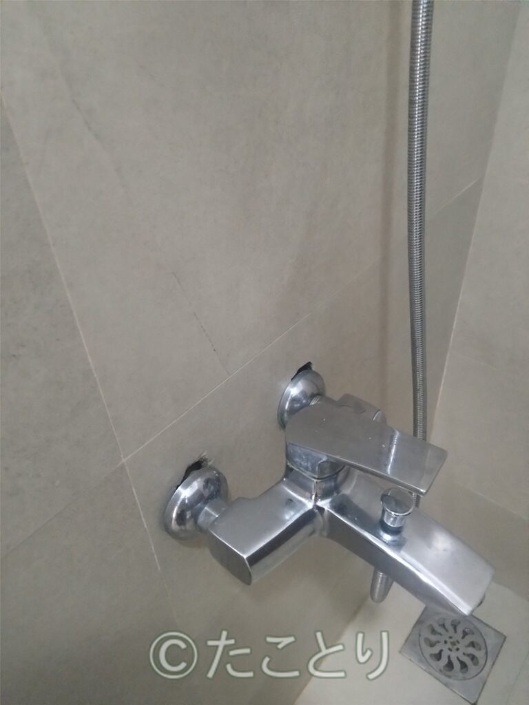 浴室のシャワーはうーん、こちらの内装建築のレベルなのか古いシャワーヘッドが取り付いたままや、壁に穴とか。。。