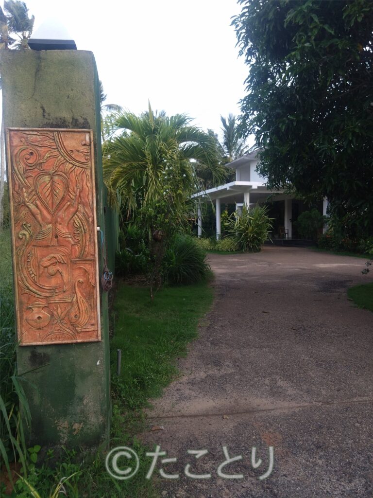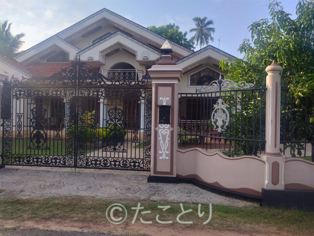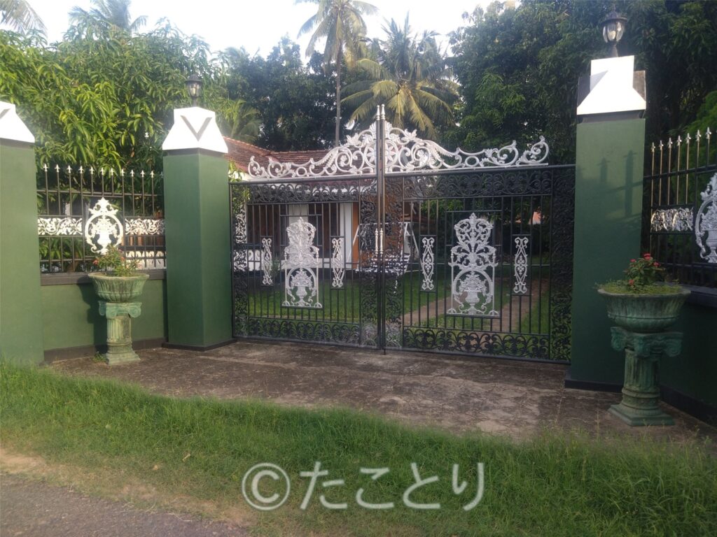今日は反対方向のお屋敷街の方をお散歩。こちらは海岸沿いの漁村とは全く違って大きな門にビデオカメラ付き。はい、スリランカは思い切り格差社会です。