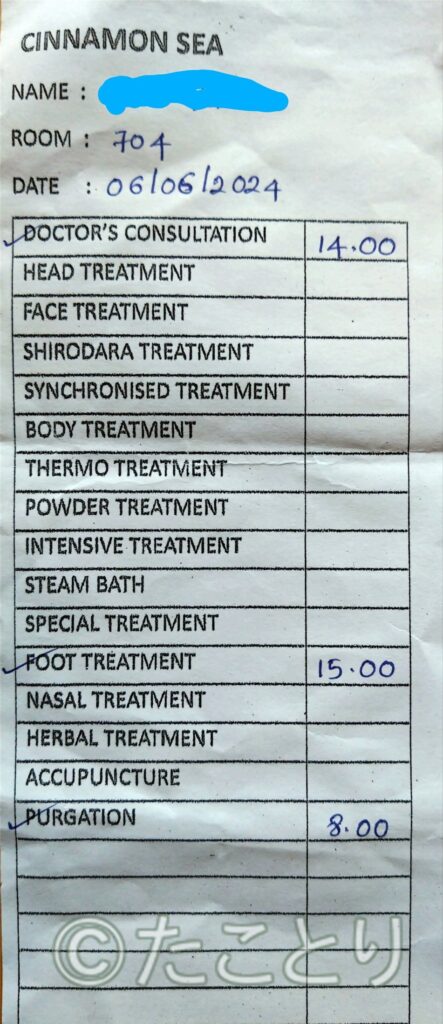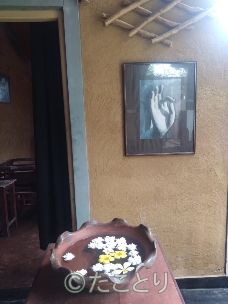 朝食無しで8時に施設内のアーユルヴェーダセンターへ行きます。で、今回はちょっとアーユルヴェーダセンターをご紹介。施設の中はさすが仏教の国で仏陀像が鎮座。そういえば初日に仏様にお祈りしつつドクターから一緒に白い糸を手首に巻いて貰いました。水桶には毎日違うお花が浮かんでいます。
