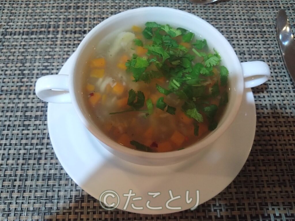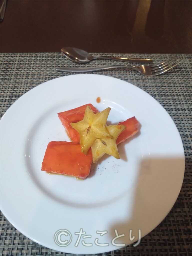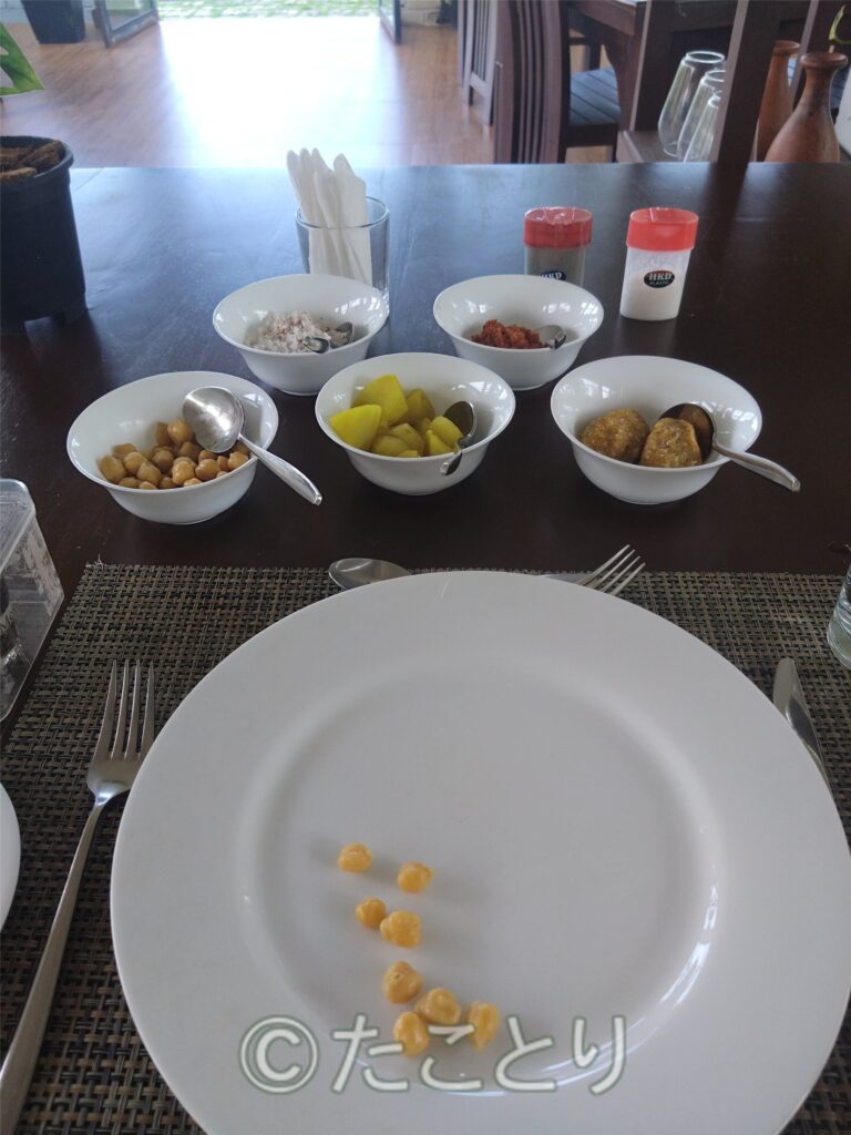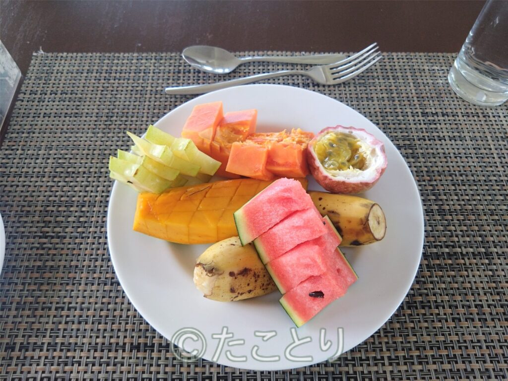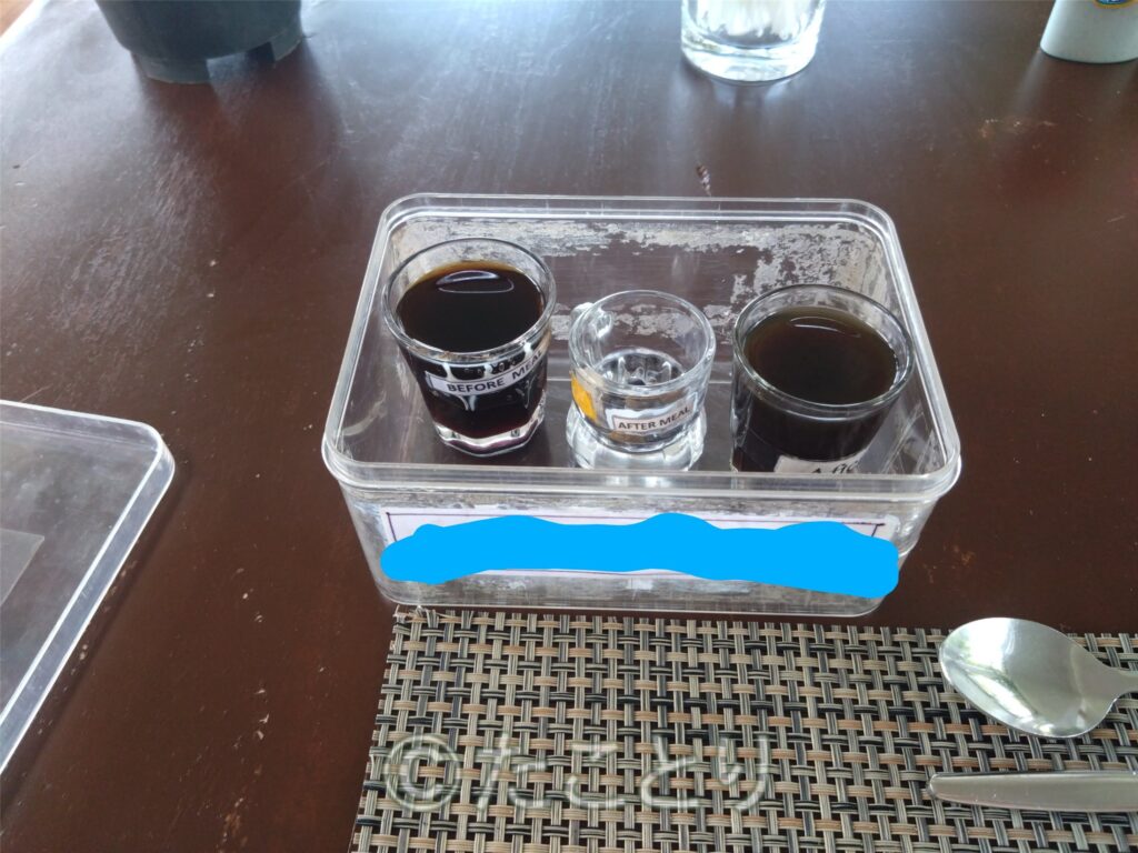 昨日の腸洗浄が終わったので朝食はここに来て初めて通常の食事を取れます。で、ご覧の通り食前食後のお薬もありますが、フレッシュフルーツジュース、前菜はココナッツミルクベースのスープ。豆と刻みココナッツと唐辛子ソースを他の付け合わせと混ぜて食べるのが主菜です。デザートは南国フルーツの盛り合わせでお腹いっぱいです。
