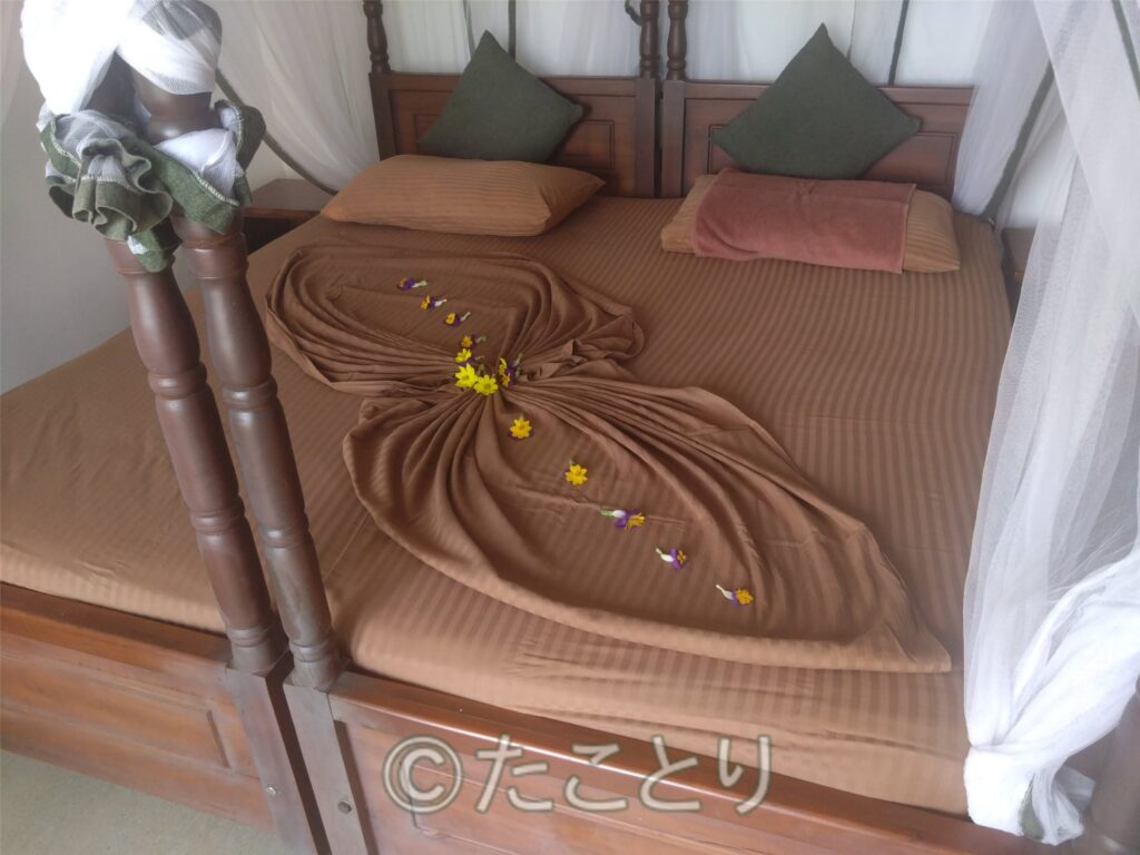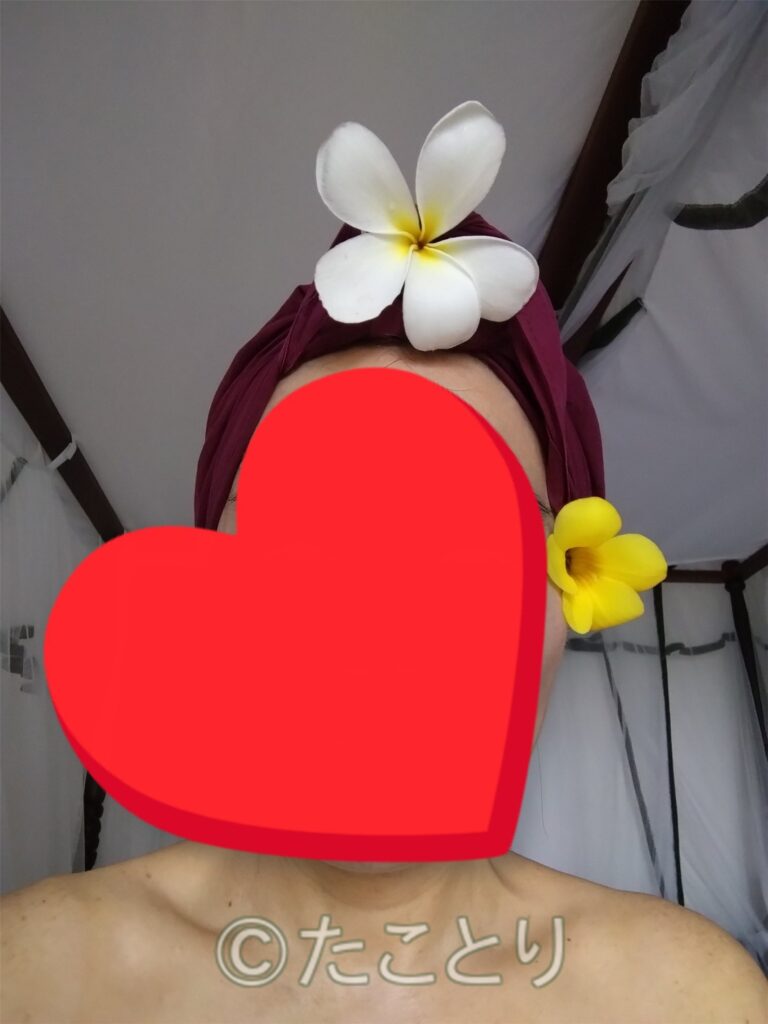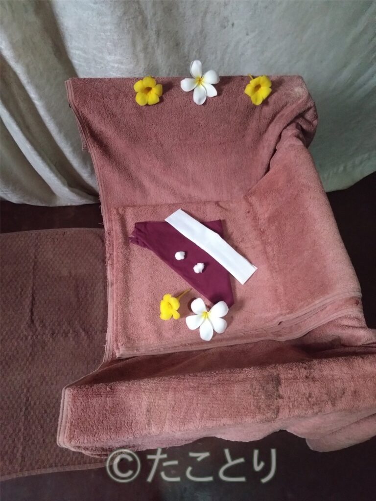 終わったら、椅子においてあったお花をターバンにも飾ってくれてお部屋で静かに過ごします。又、お部屋お掃除の方がオイル染みを気遣ってシーツも茶色にして又枕カバーにもバスタオルを巻いてくれている、この心遣いが嬉しいです。さすが毎日このように綺麗にシーツを折り紙してくれる人だけあるなーと思います。