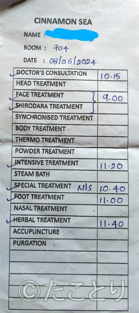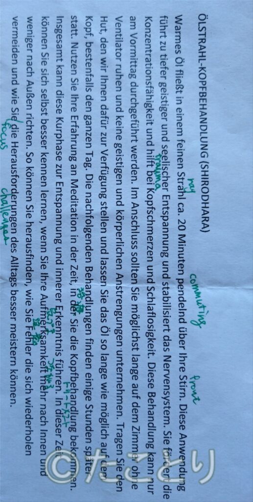 そして今日はいよいよシロダーラを実施とのこと。ご存じない方には一応、シロダーラはオイルをおでこにゆっくり垂らすのですが脳の浄化と言われています。