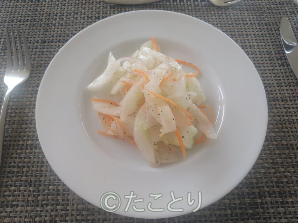 お昼はまた前に出た瓜みたいな野菜のサラダと各種野菜カレーと生のミックスフルーツとカードというヨーグルトみたいな乳製品のデザート。