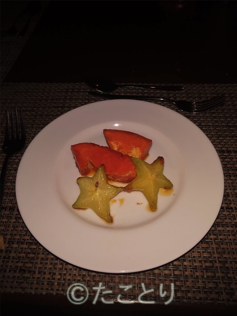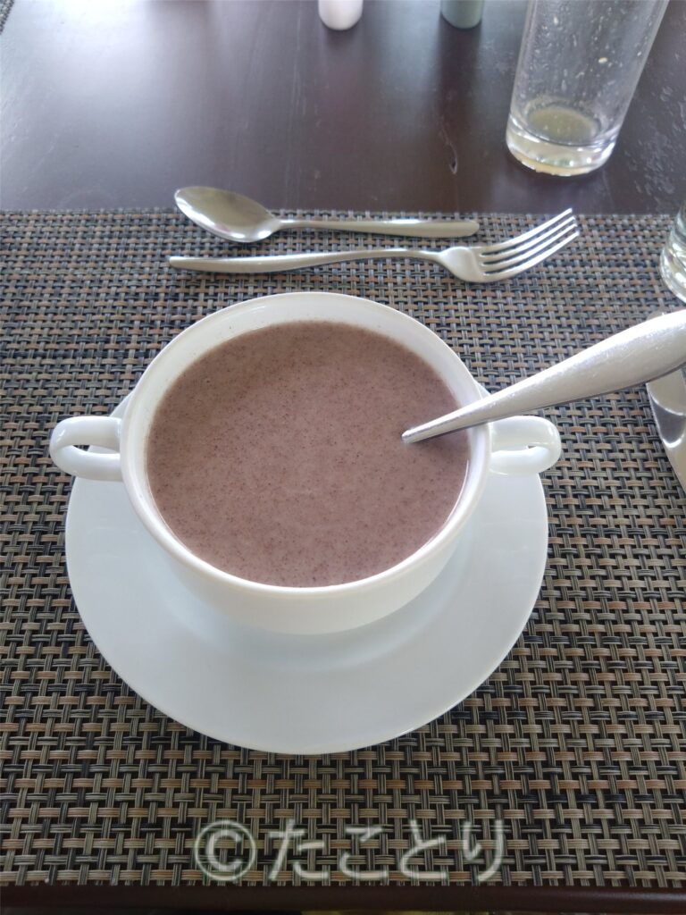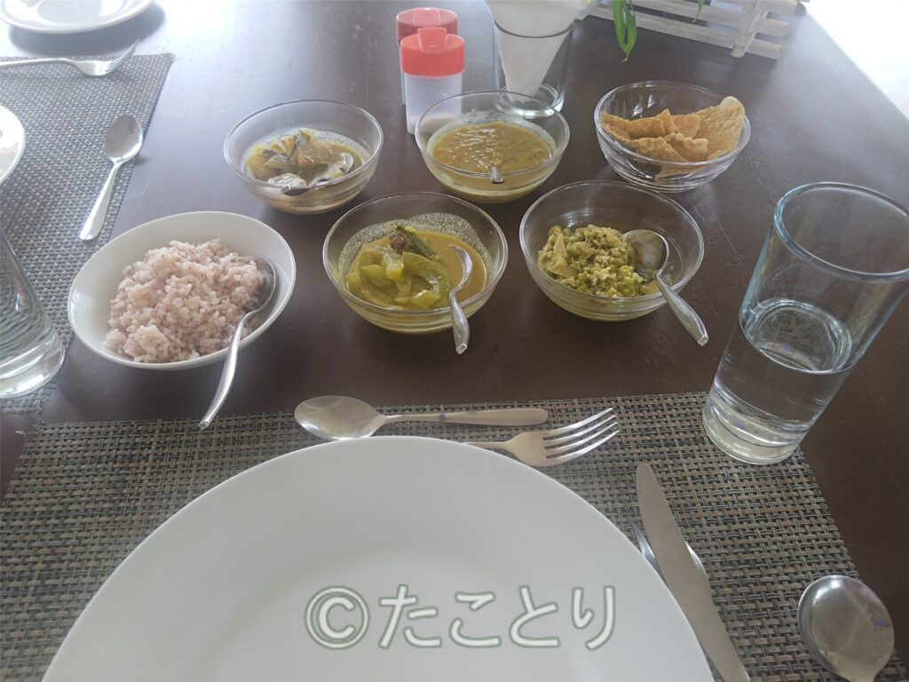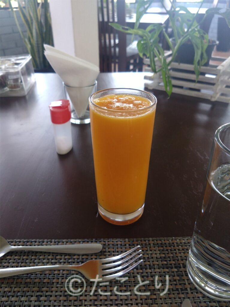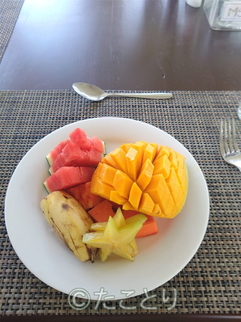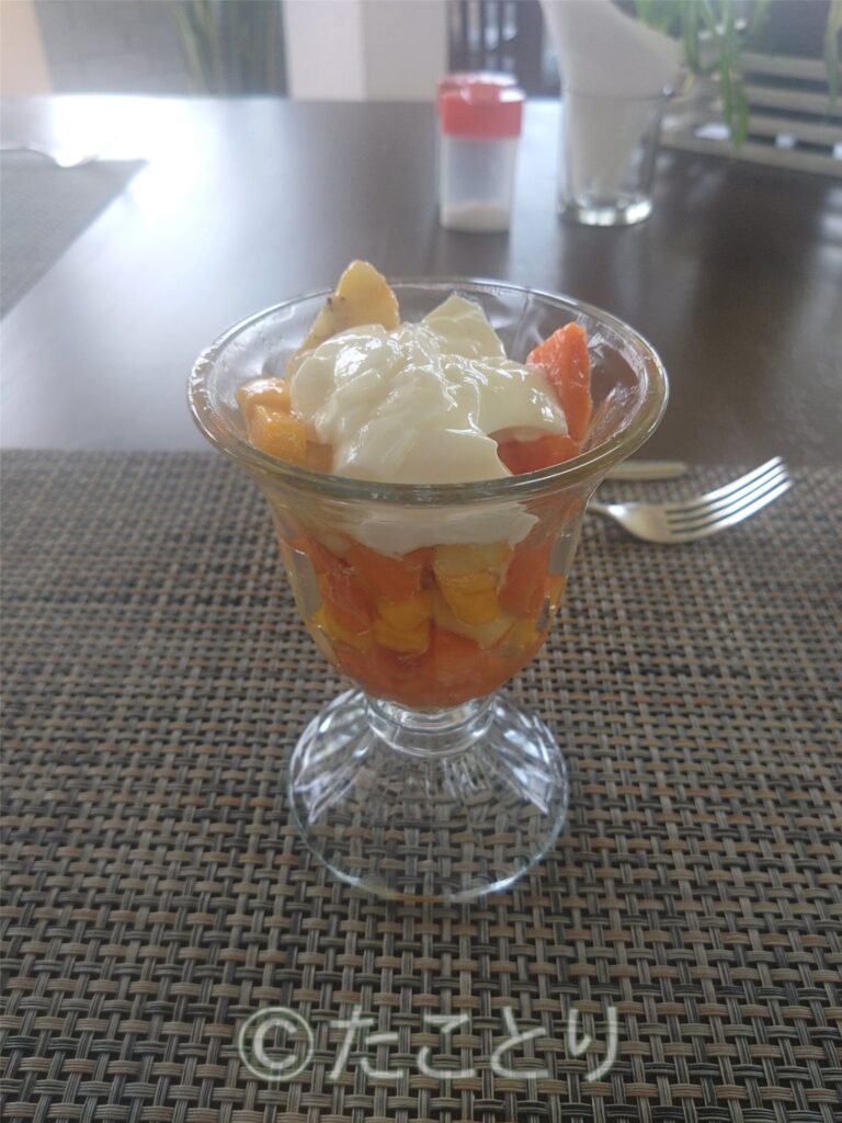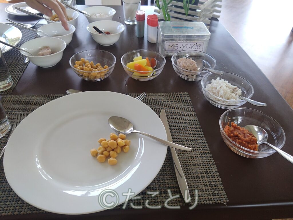 そしてその作ったスープと定番となったフルーツジュースに今日はひよこ豆と野菜と唐辛子ソース、フルーツの盛り合わせと健康的で盛り沢山な朝食です。