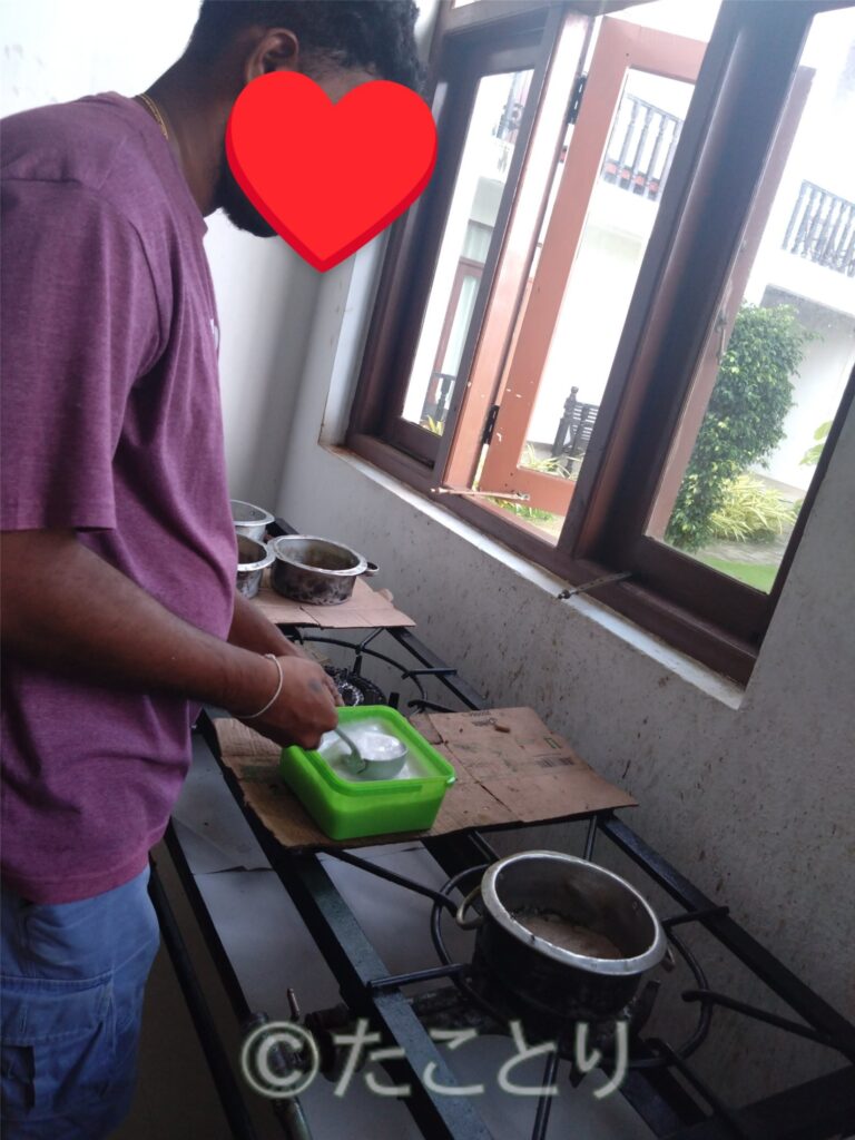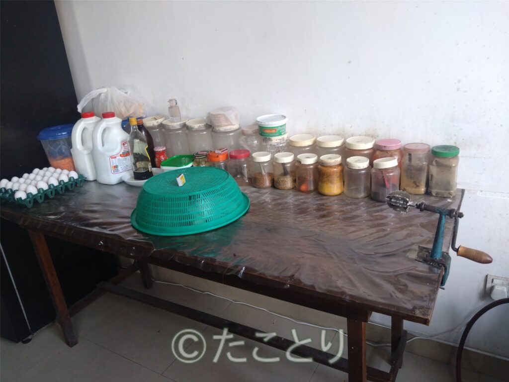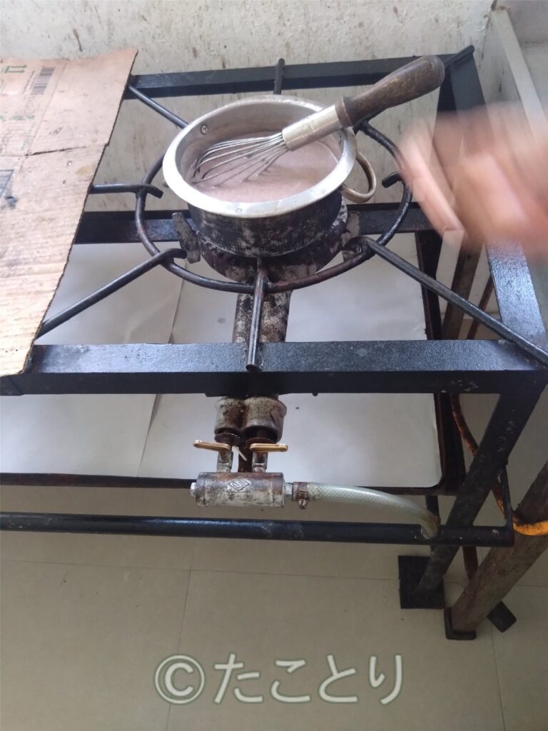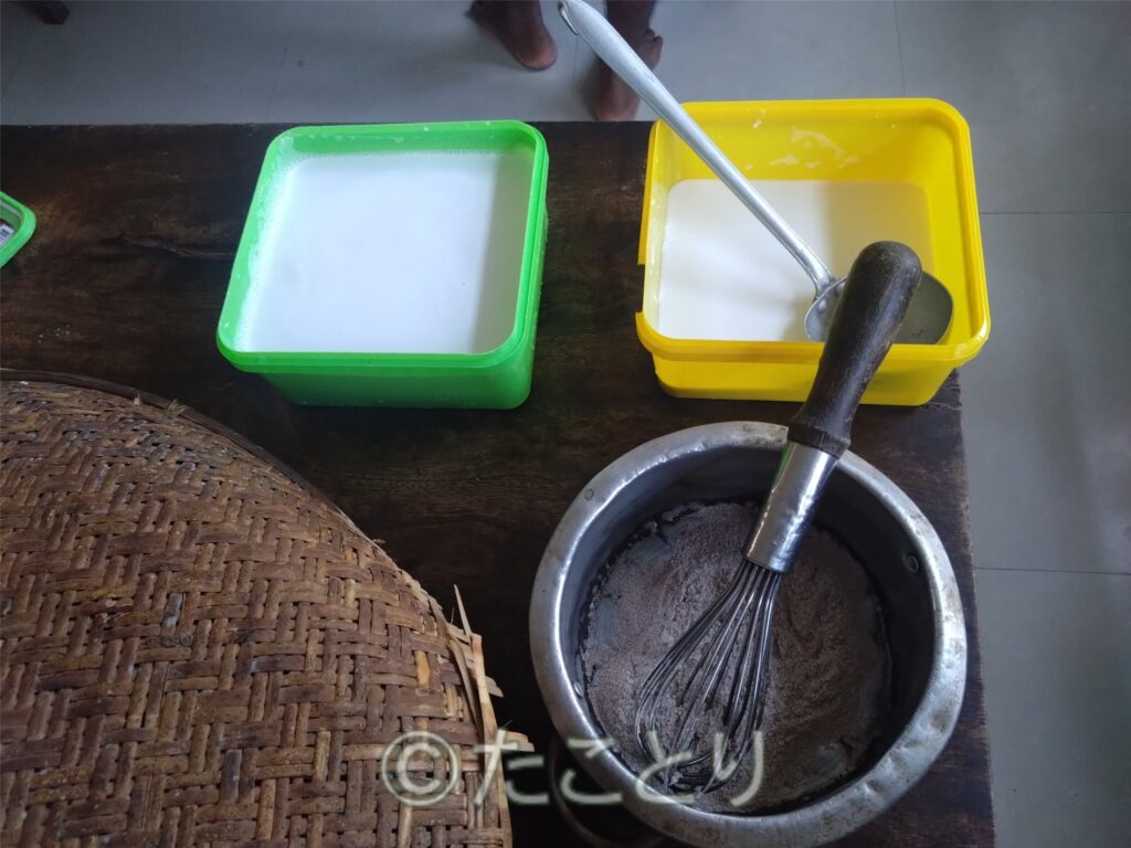 シロダーラも5日目となるとかなりだれてきていますが、今日は朝にお料理教室を実施してくれるとのこと。それで、以前美味しいと言ったクラカンというヒエの粉を使ったスープの作り方を教わりました。かなり年季の入った道具で作ってくれて、又ご覧の通りキチンと整理されています。ココナッツミルクも水分量の違いで2種類あるというさすが、本場ならではです。