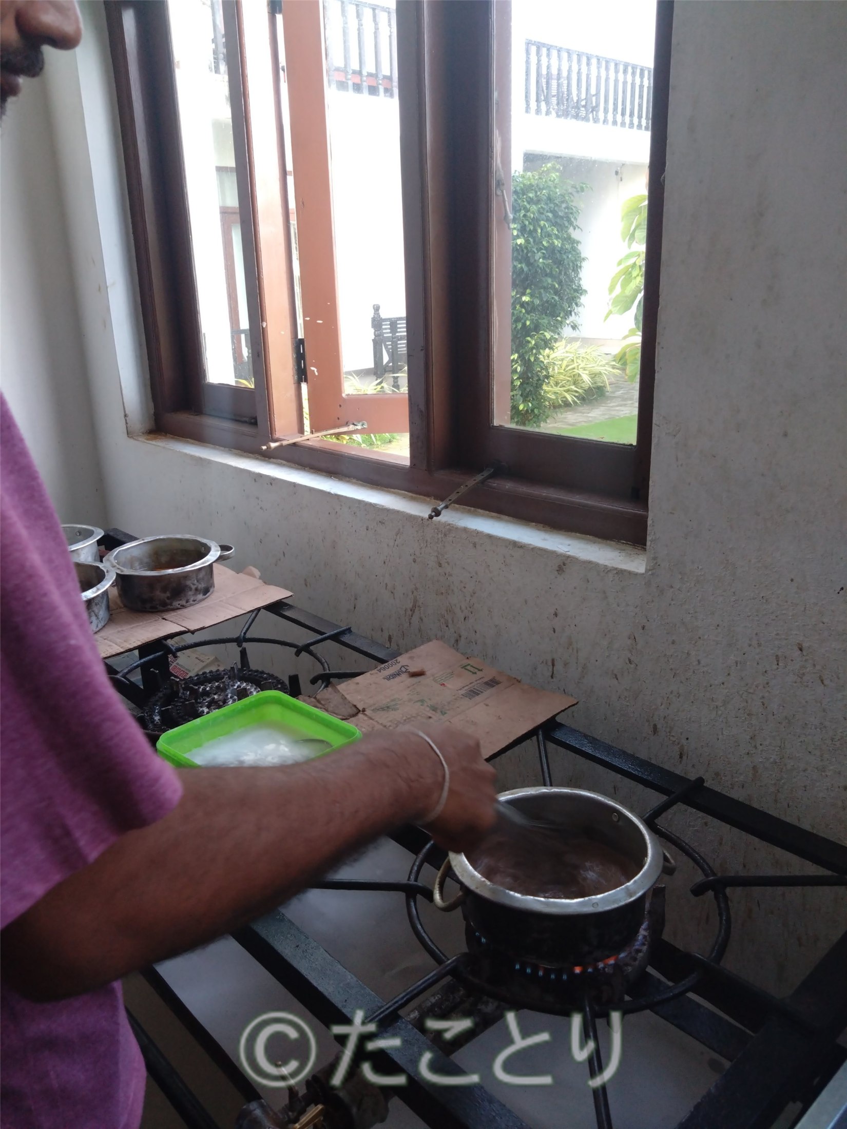 シロダーラも5日目となるとかなりだれてきていますが、今日は朝にお料理教室を実施してくれるとのこと。それで、以前美味しいと言ったクラカンというヒエの粉を使ったスープの作り方を教わりました。かなり年季の入った道具で作ってくれて、又ご覧の通りキチンと整理されています。ココナッツミルクも水分量の違いで2種類あるというさすが、本場ならではです。