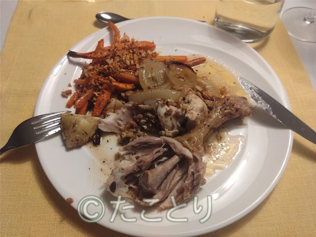 いつもの如く二人で用意で、メインは鶏の丸焼き野菜の付け合わせ、デザートはクレームドブリュレ🩷。