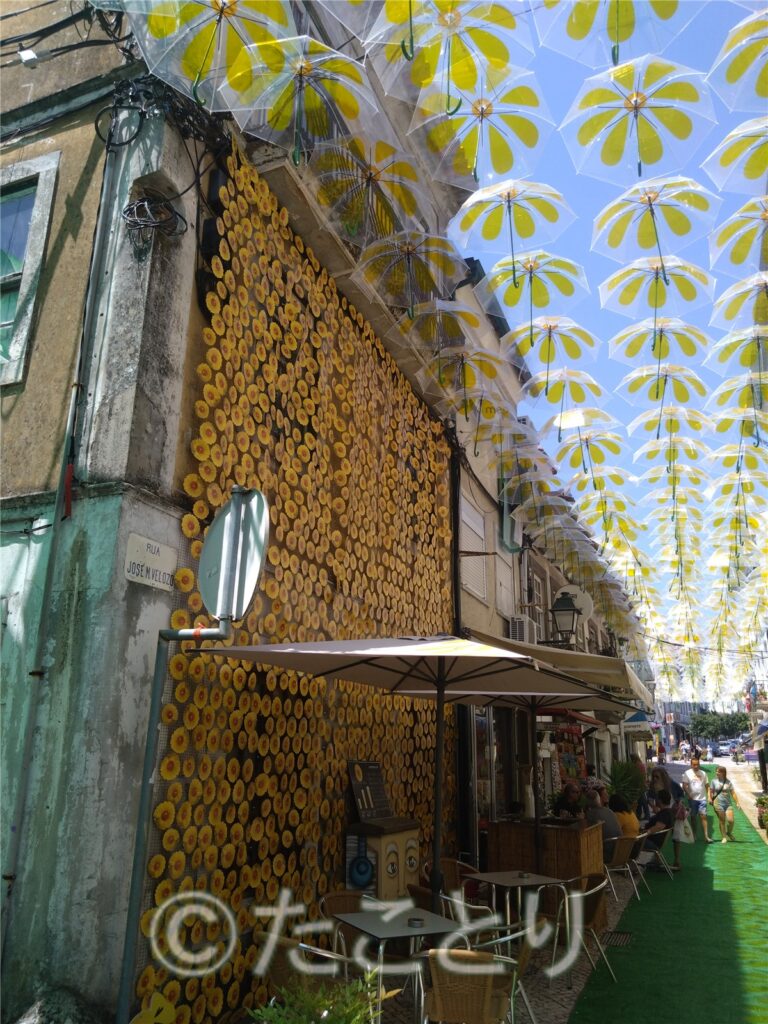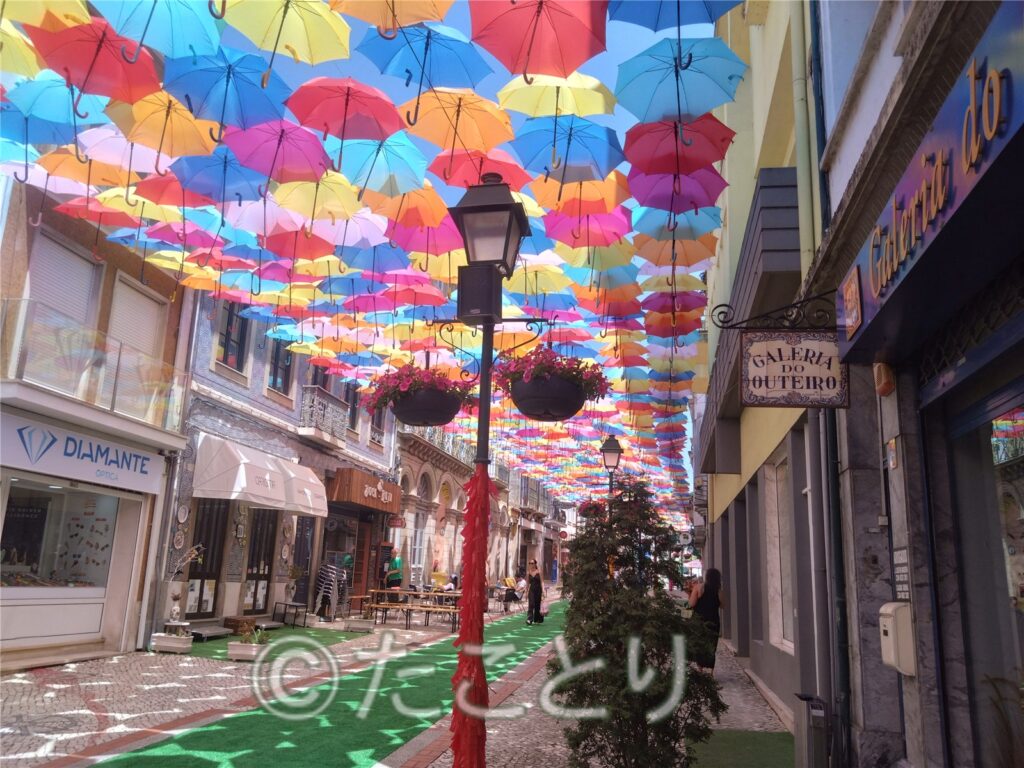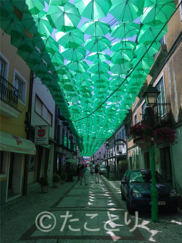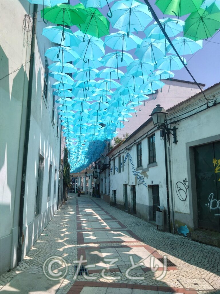で、てくてく歩いて15分くらいでやっと念願の傘祭りをしている通りへ!二人共、思い切りテンション上がって写真📷️を撮りまくっていると、あちこちに日本人と思しき人々がいました。ポルトのあちこちで聞こえてくる中国語は無くて、やはりポルトと違ってちょっと遠いのでやはり余程の思い入れが無いと来ませんよね。又、この傘で日陰を作って暑い日も快適に外を歩けるというのが理解出来ました。