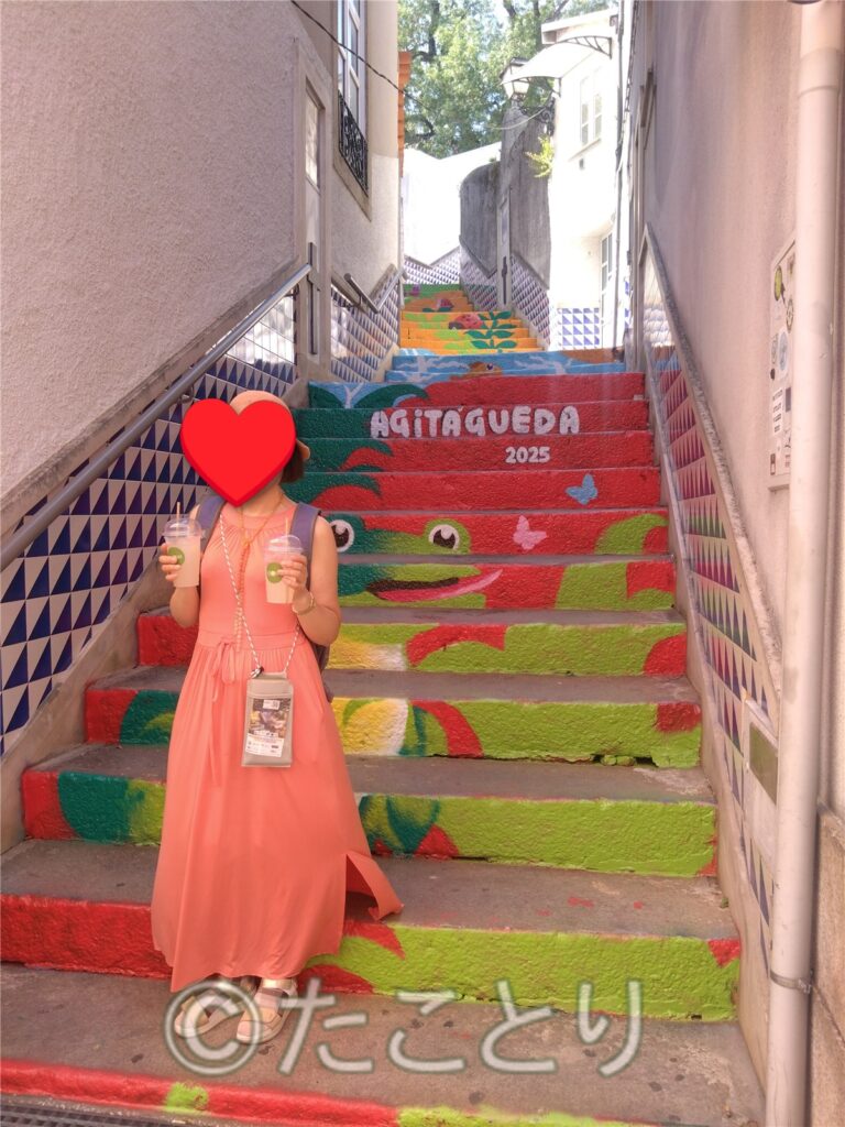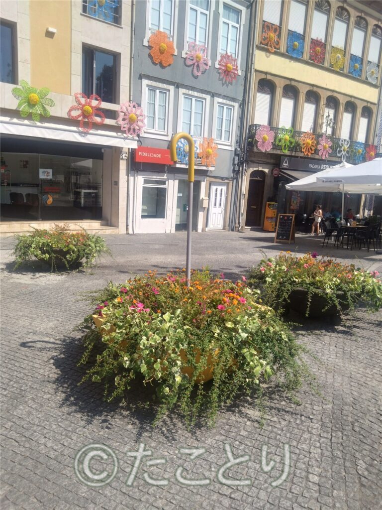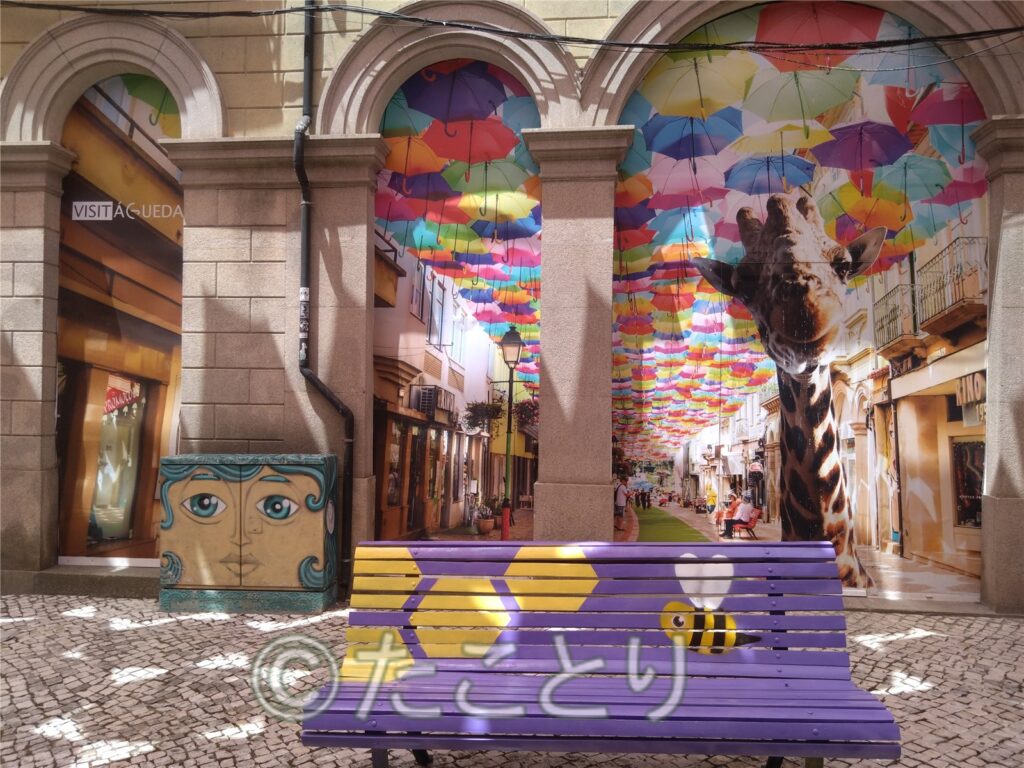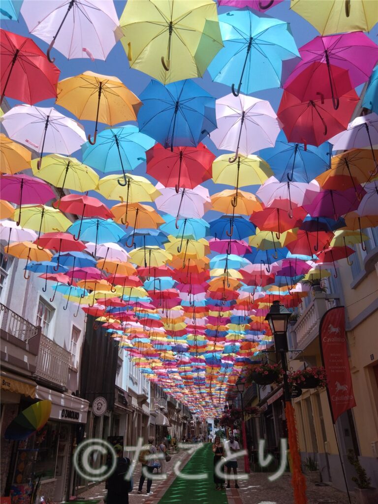 で、てくてく歩いて15分くらいでやっと念願の傘祭りをしている通りへ!二人共、思い切りテンション上がって写真📷️を撮りまくっていると、あちこちに日本人と思しき人々がいました。ポルトのあちこちで聞こえてくる中国語は無くて、やはりポルトと違ってちょっと遠いのでやはり余程の思い入れが無いと来ませんよね。又、この傘で日陰を作って暑い日も快適に外を歩けるというのが理解出来ました。