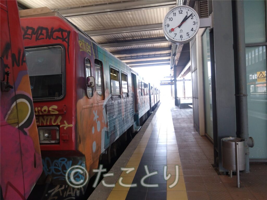 事前に予定通りに発車する事を駅で確認してから走って戻って来ましたら、電車の表示がありません。何が起きたのか解らず、取り敢えず予定のプラットフォームに行ってみたのですが酷く落書きされた電車が止まっているだけです。それでポルトガル人らしき若い女性にも聞いてみたところ携帯のウェブサイトを見せてくれてキャンセル❎️されたようだと教えてくれました。駅の旅行センターへ行き聞いてみたところ、ただキャンセルされて本日アゲダへ行く便は一本しか無いとの事😱。