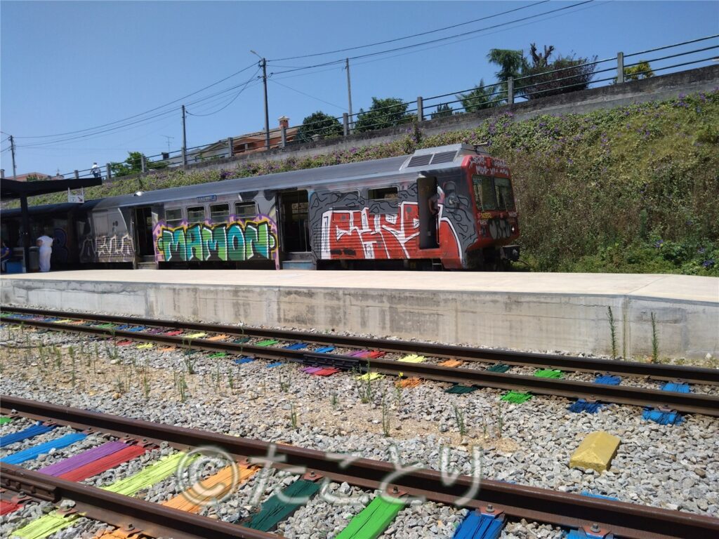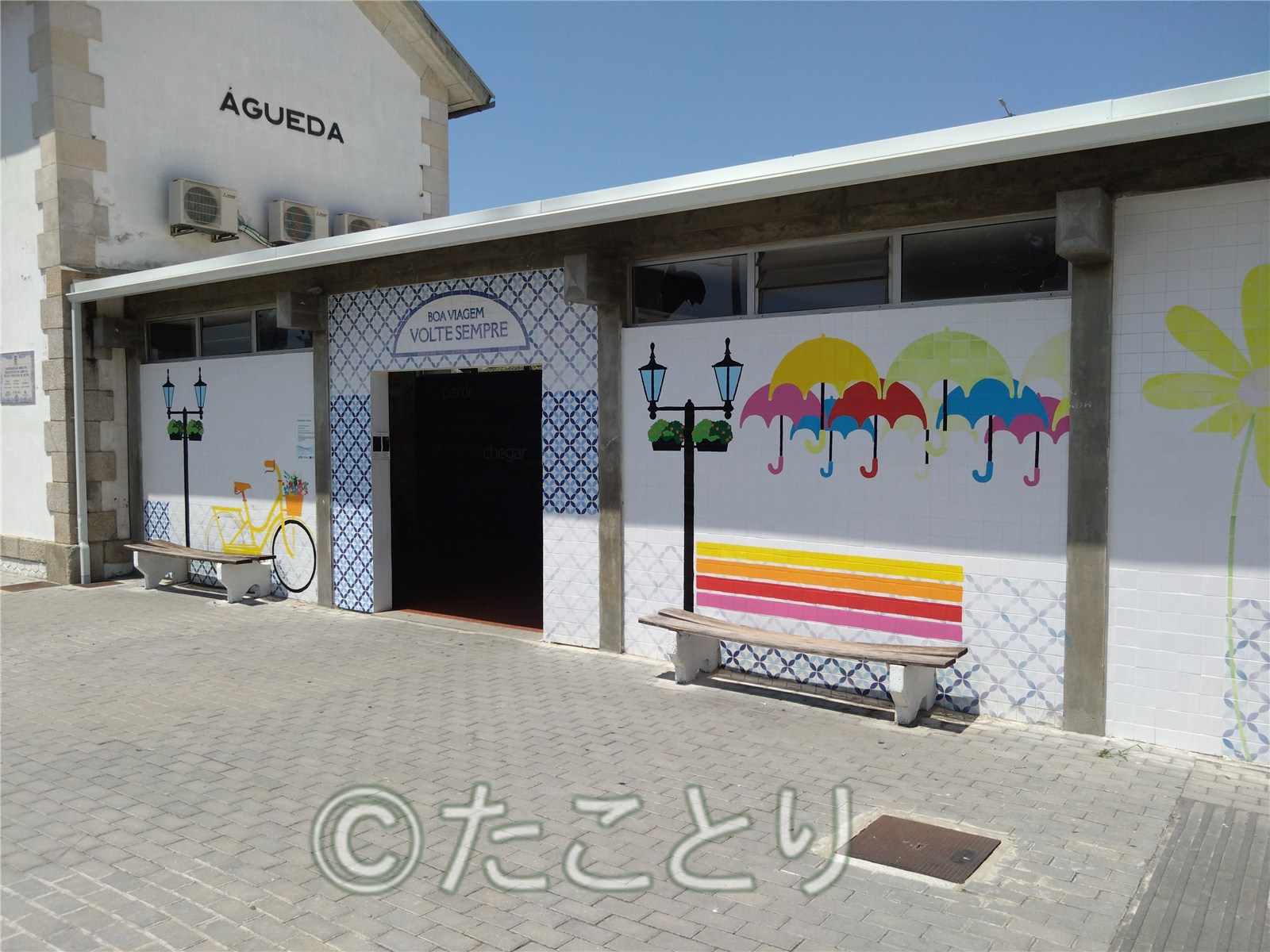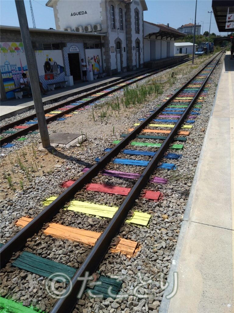 結局、その酷く落書きされている小さな2両程しかない電車が動いてアゲダへ。初め1両目に乗っていたのですが、ディーゼルエンジン排ガスが窓からもろに入ってきてドイツ友人は「健康に悪い」と言って慌てて2両目に乗り換えてやっと到着〜。ご覧の通り無人駅で枕木や駅舎も可愛く彩られてとても素敵です。ただ、このアナーキーな電車と凄い対比💦