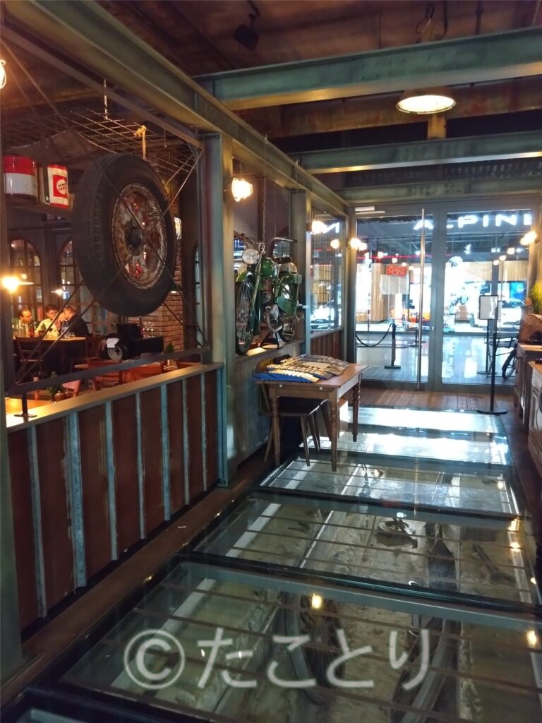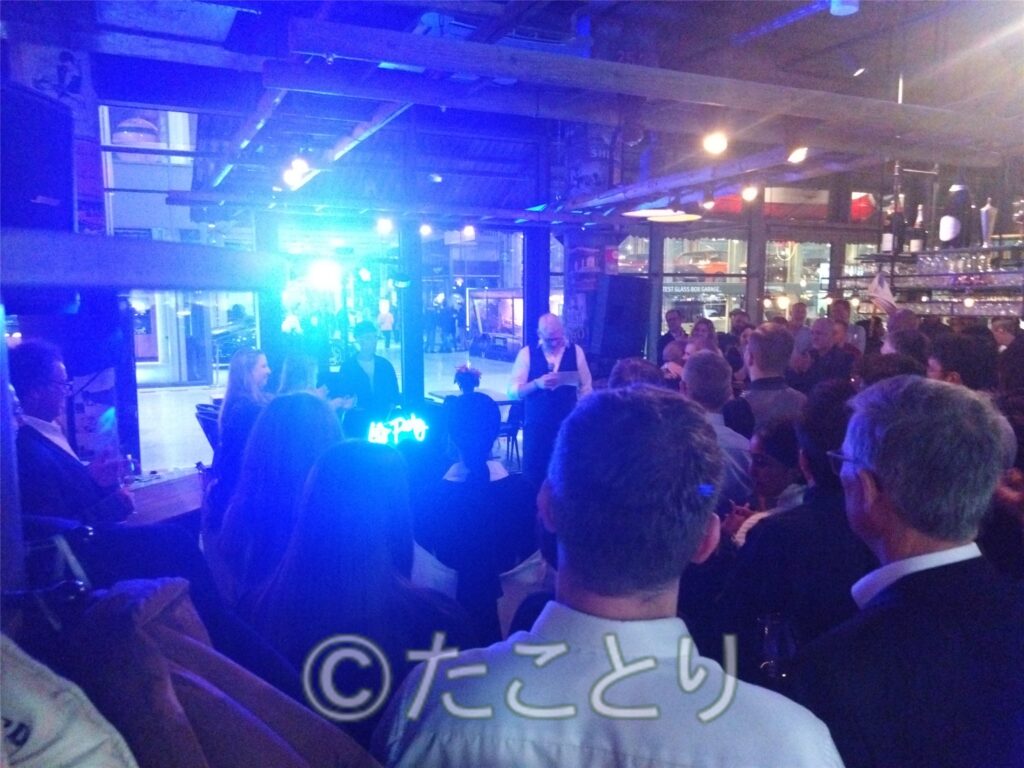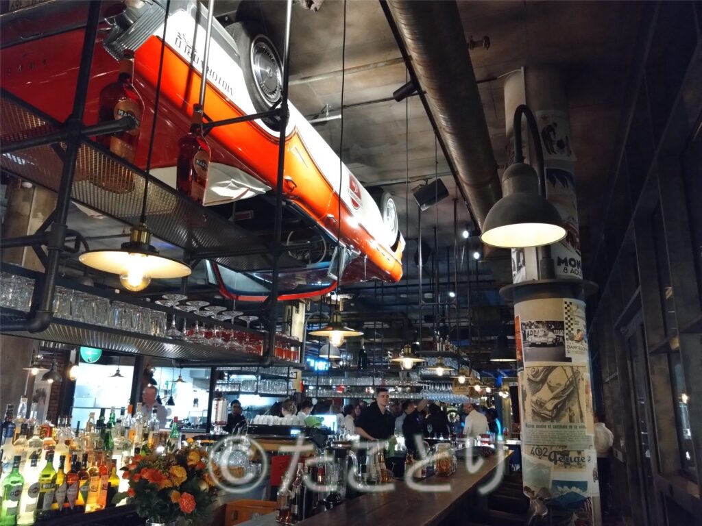 クリスマスパーティ会場はレストラン貸し切りでバーカウンターの天井には車が逆さまに飾られています。