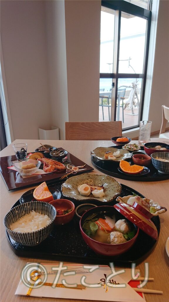 The new year’s day was so nicely started with beatiful view at the island. The breakfast was this typical Japanese style, Osechi and Ozoni.