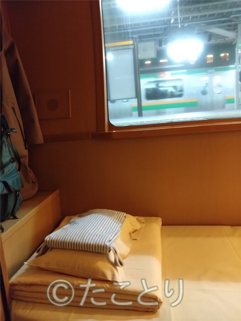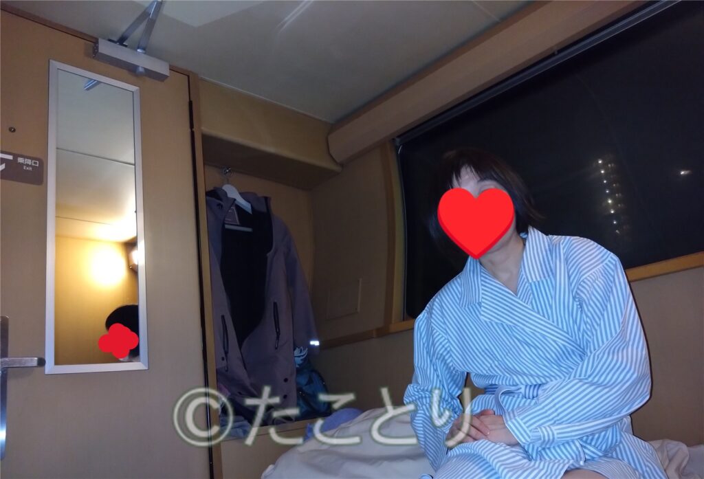 Inside of the room, they also provide the nightgown as well. I suppose as like Japanese style hotel: Ryokan always provides Yukata: easy style Kimomo, so the night train also has it. But it’s rather too short for me…